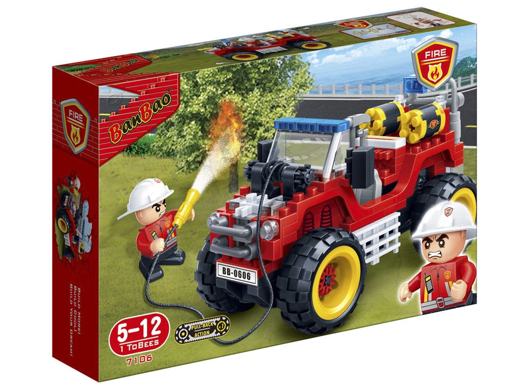 - Комплектація: 148 деталей, фігурка пожежного, машина з шлангом і баками з водою та інші аксесуари.